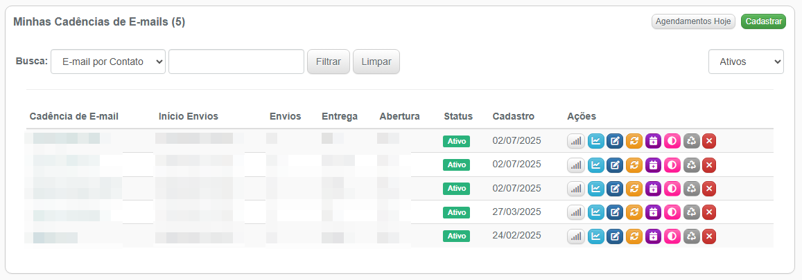 2- Você irá visualizar a tela com as cadências já criadas.