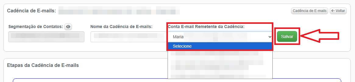 3- No primeiro bloco, no campo Conta E-mail Remetente da Cadência, selecione a conta de e-mail a ser utilizada e clique no botão verde Salvar: