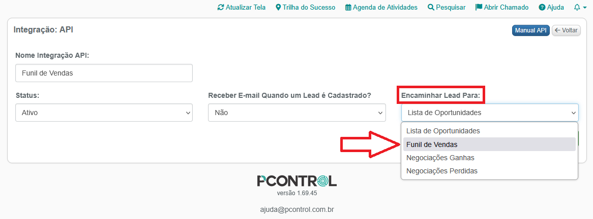 1 – Acessando a API escolha a opção Funil de Vendas na opção Encaminhar Para: