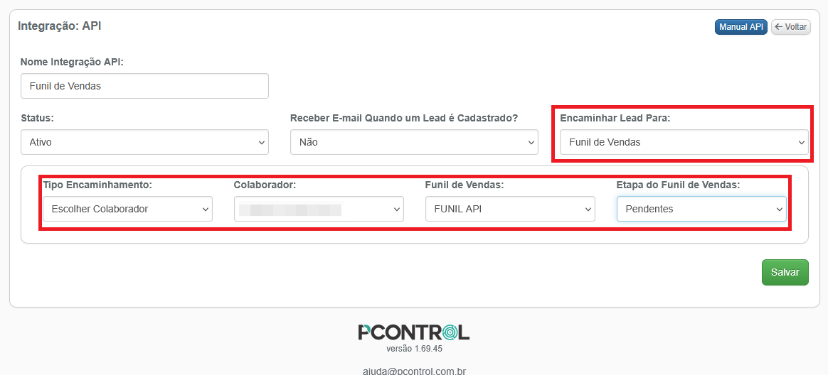 2 – Confira se a opção Funil de Vendas está selecionada. Defina também se o envio dos leads da API serão para um colaborador específico, como no exemplo, ou se será alternada entre todos com acesso ao funil. Selecione o Funil de destino e a etapa do funil que receberá estes leads. Em seguida clique em salvar.