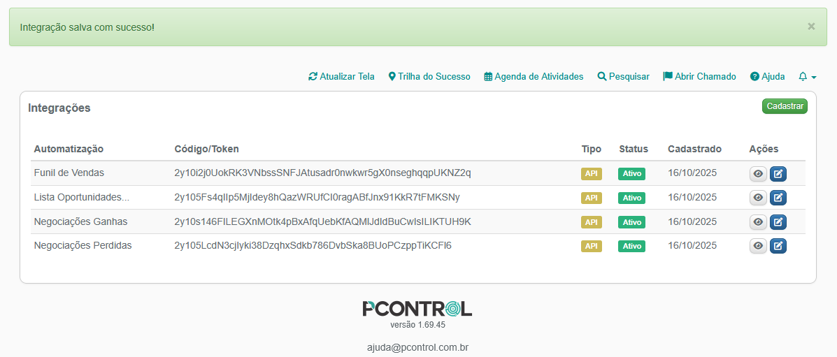 3 – A Integração será salva e ela será listada na lista de integrações, atenção Código/Token gerado. Na coluna ações clique no botão detalhes, ícone de um olho.