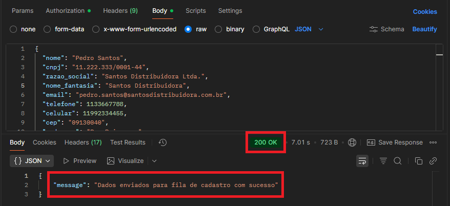 8 – Após enviar a requisição, o retorno deve ser um HTTP Status Code 200 com a mensagem “Dados enviados para fila de cadastro com sucesso”.