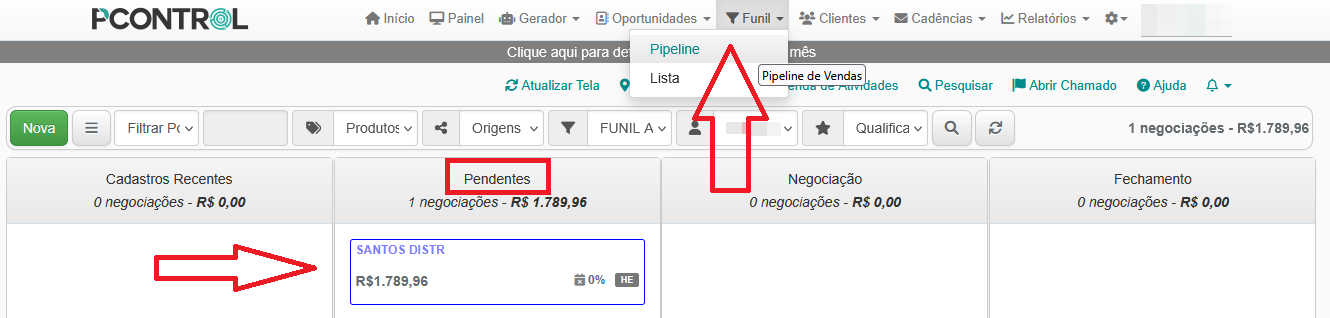 9 – Acessando o funil de vendas no Pcontrol, clicando no menu superior Funil e em seguida em Pipeline ou Lista, o lead enviado é encontrado no funil e etapa correspondentes.