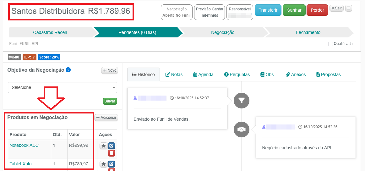 10- Acessando a negociação, é possível ver os detalhes dos produtos cadastrados e também das observações enviadas através da API.