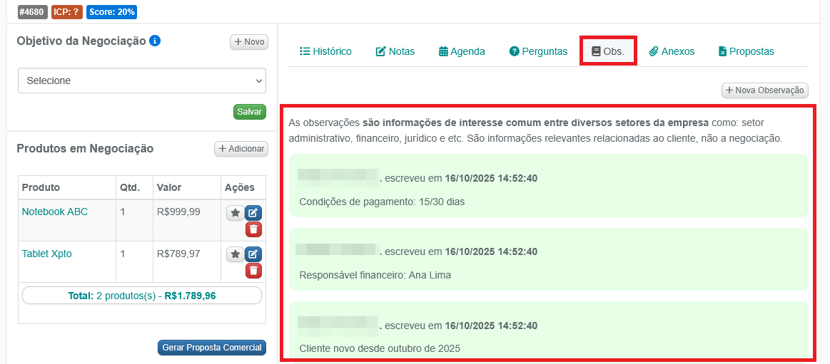 11- Clicando na guia Observações (Obs.), você terá acesso as observações que foram cadastradas junto com o lead:
