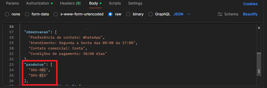 7- Na requisição é também é possível enviar uma lista de produtos. Eles devem ser enviados em forma de array e devem ser enviados os códigos SKU dos produtos cadastrados no Pcontrol.