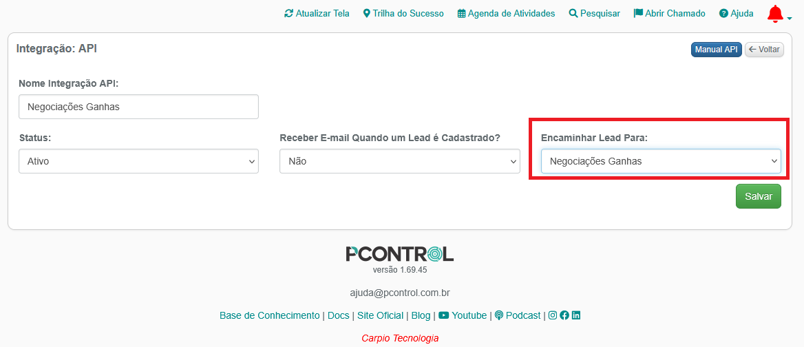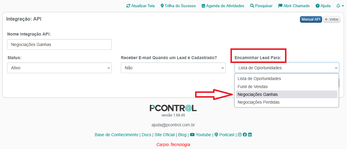 1 – Acessando a API escolha a opção Negociações Ganhas na opção Encaminhar Para: