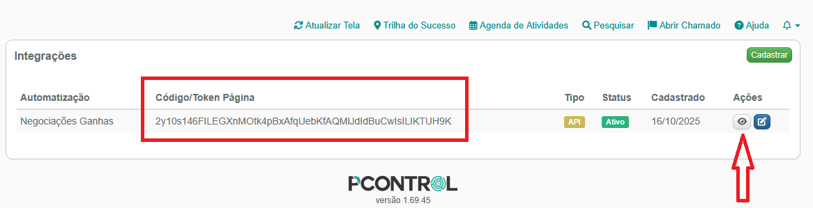 3 – A Integração será salva e ela será listada na lista de integrações, atenção Código/Token gerado. Na coluna ações clique no botão detalhes, ícone de um olho.