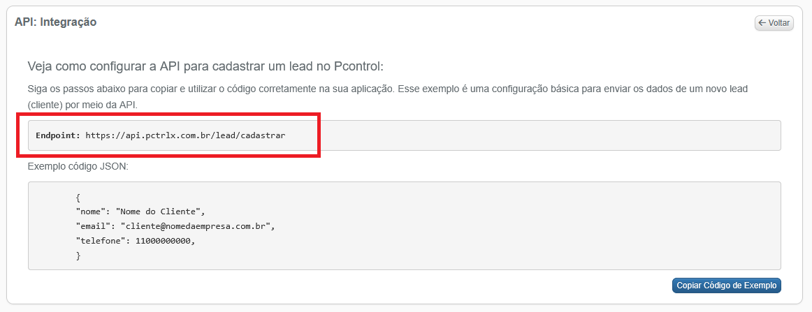 4 – Veja o endpoint da API do Pcontrol e um código JSON de exemplo que você pode copiar e colar.