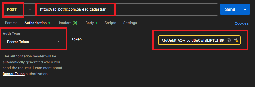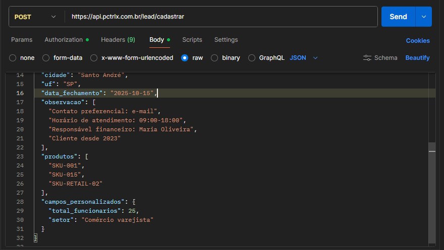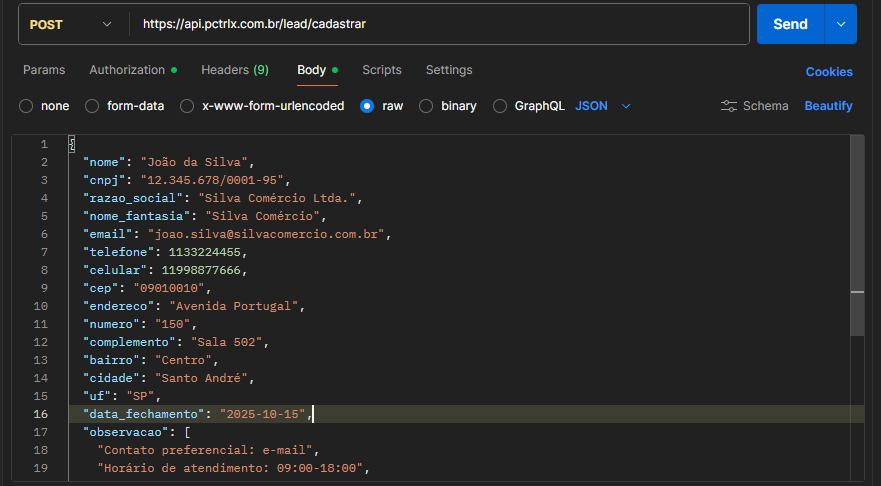 Atenção: O lead enviado na requisição cai em uma fila e será cadastrado no Pcontrol em alguns minutos. O cadastro não é instantâneo a partir do envio da requisição.