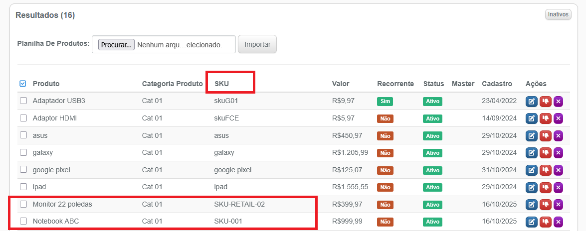 8- Na requisição é também é possível enviar uma lista de produtos. Eles devem ser enviados em forma de array e devem ser enviados os códigos SKU dos produtos cadastrados no Pcontrol.
