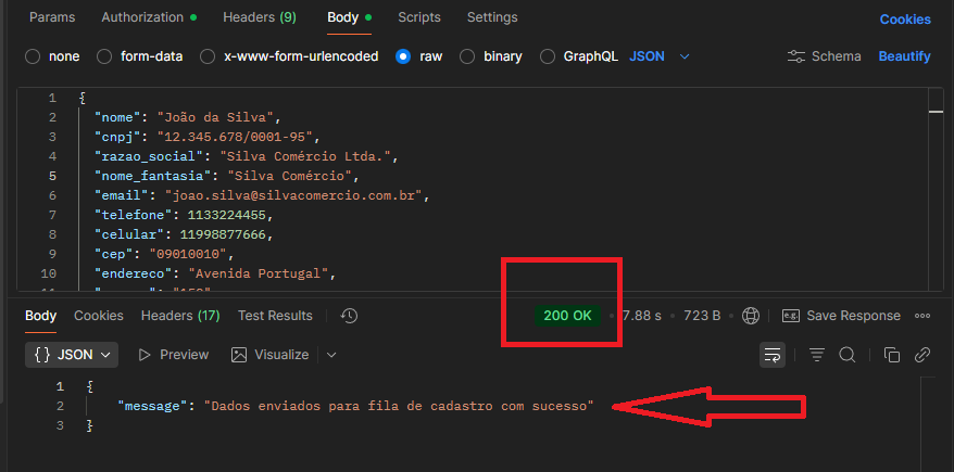 9 – Após enviar a requisição, o retorno deve ser um HTTP Status Code 200 com a mensagem “Dados enviados para fila de cadastro com sucesso”.