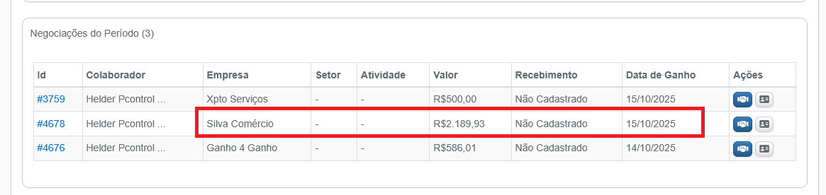 10 – Acessando o relatório de negociações ganhas no Pcontrol, o lead enviado é encontrado no período referente.