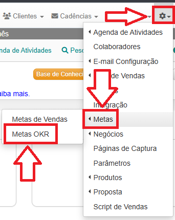 1- Clique no menu Engrenagem, em seguida vá até a opção Metas e clique em Metas OKR.