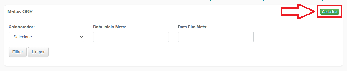 2-Você será direcionado para a janela onde são listadas as metas OKR definidas em sua conta. Clique no botão verde Cadastrar para adicionar uma nova meta OKR: