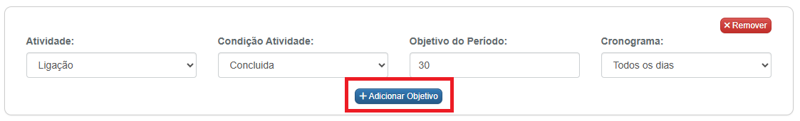 4- No bloco seguinte, escolha a atividade, a condição que deverá ser obtida (atividade agendada ou concluída), o objetivo de atividades concluídas no período e o cronograma, que pode ser diário, excluir os sábados ou excluir sábados e domingos: