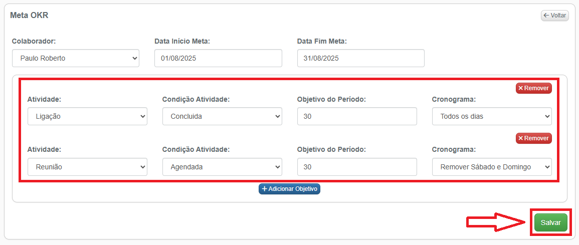 5- Após cadastrar todos os objetivos desejados, clique no botão verde Salvar: