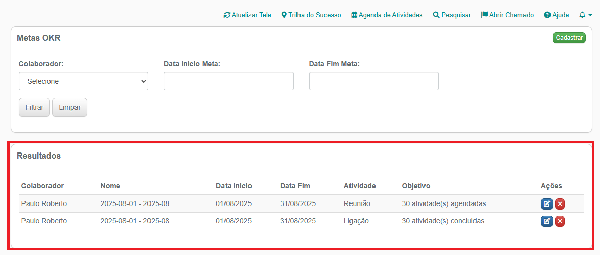 7- Sus metas OKR cadastradas serão exibidas na tela principal das Metas OKR: