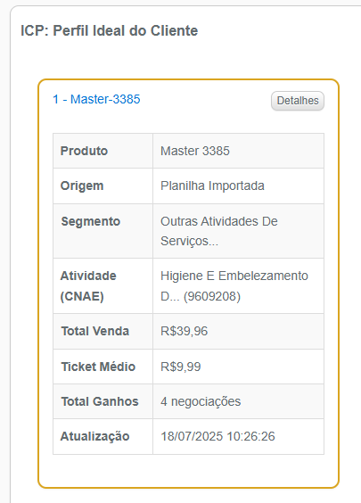O ICP, no Pcontrol a Persona é gerado com base mos clientes ganhos nos últimos 6 meses,  os quais são agrupados por 4 dados: produto, canal de origem, segmento de mercado e atividade econômica. É necessário ter no mínimo 3 clientes com o exatamente o mesmo perfil para que um ICP seja gerado.