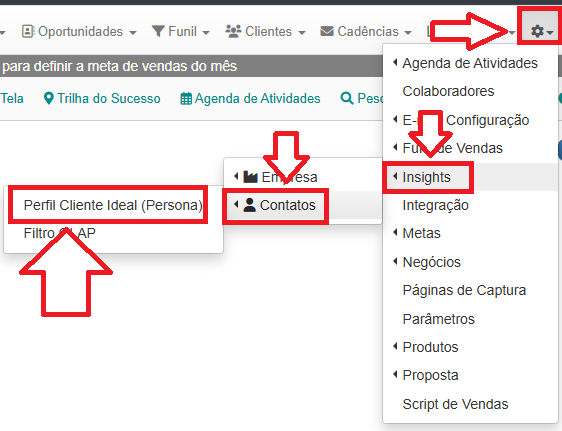 Para acessar as informações da Persona no Pcontrol, clique no menu Engrenagem, em seguida vá até o menu Insights, acesse a opção Contatos e clique em Perfil Cliente Ideal (Persona):