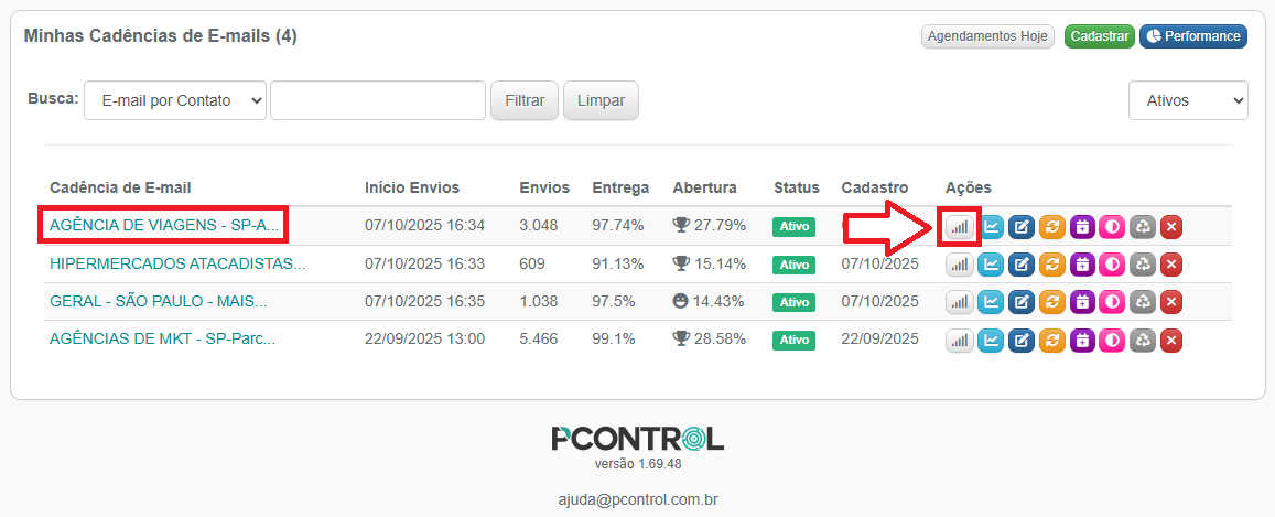 3- Localize a cadência desejada e clique no botão branco (relatório de acompanhamento) na coluna Ações.