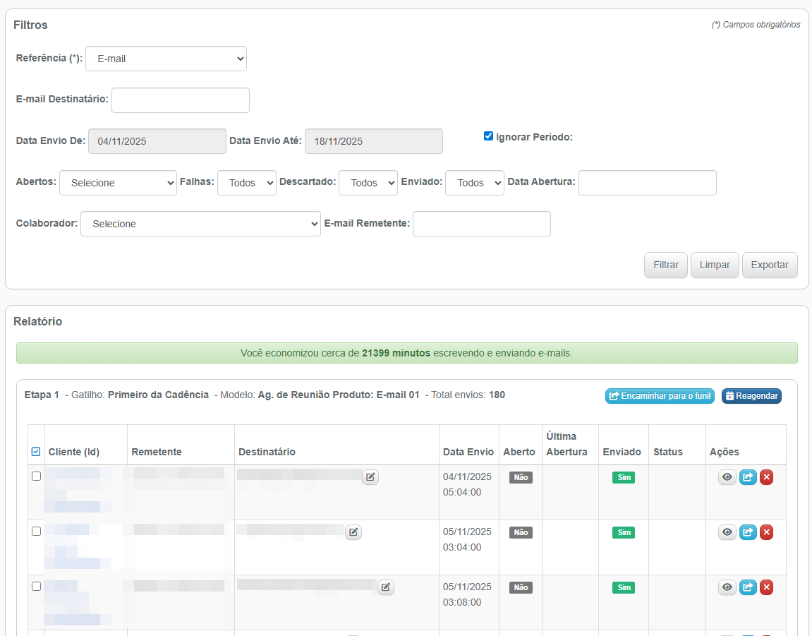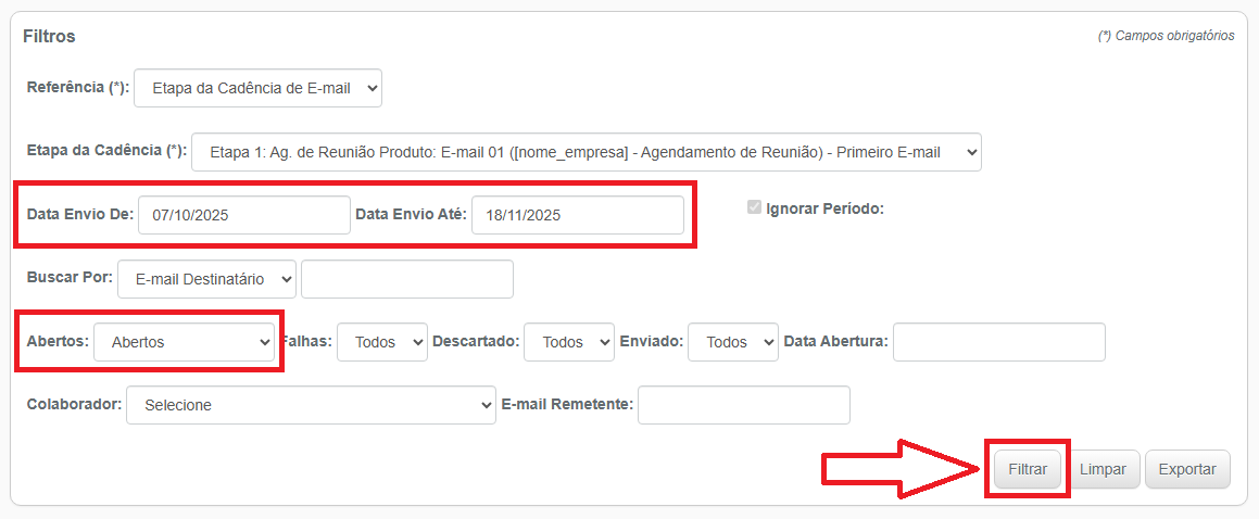6- Ajuste o período para exibir os envios desde o início dos disparos. Em seguida, marque a opção de filtro Abertos para visualizar quem abriu os e-mails naquela etapa específica.