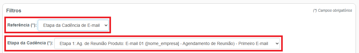 5 -Para alterar o filtro das etapas, selecione primeiro em Referência a opção Etapa. Depois, escolha no campo Etapa da Cadência a etapa da cadência que deseja visualizar.
