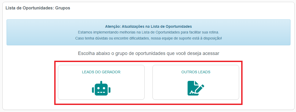 2- Selecione a opção Leads do Gerador, para os contatos entregues pelo robô, ou Outros Leads para os contatos de outras origens.