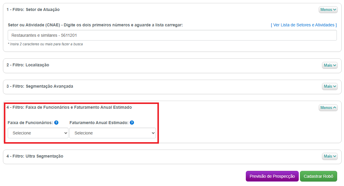 2- Nas configurações do robô, defina a atividade econômica, estado e demais filtros, caso necessário. Em seguida, vá até o bloco Filtro: Faixa de Funcionários e Faturamento Anual Estimado. Ao expandir, você verá as opções para definir os filtros de Faixa de Funcionários Estimado e de Faturamento Anual Estimado: