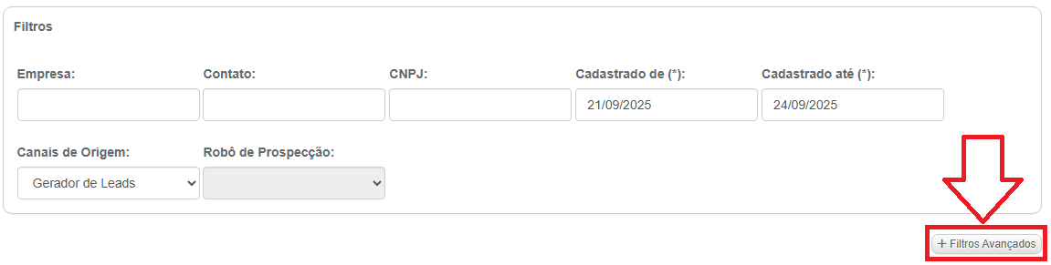 3- No bloco dos filtros, clique no botão + Filtros Avançados, para exibir todas as opções de filtros