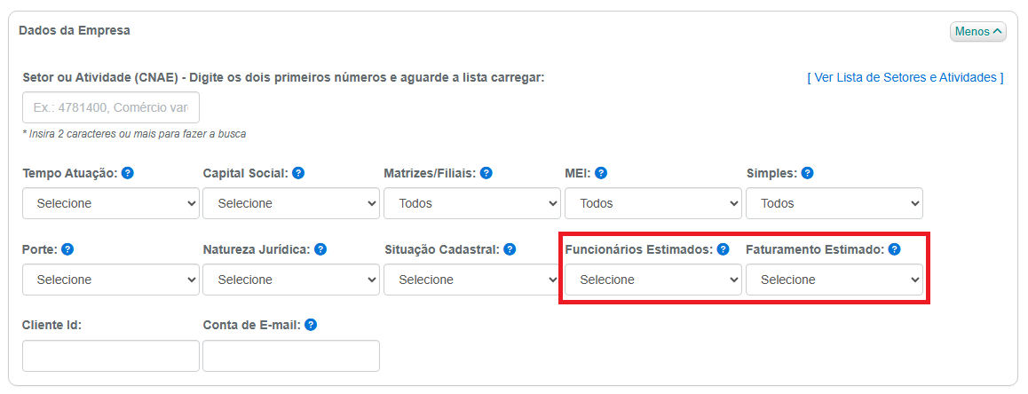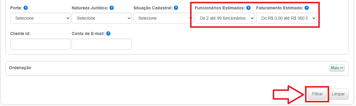 5- Selecione a opção desejada no campo Funcionários Estimados ou no campo Faturamento Estimado.