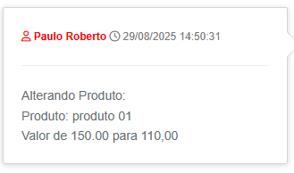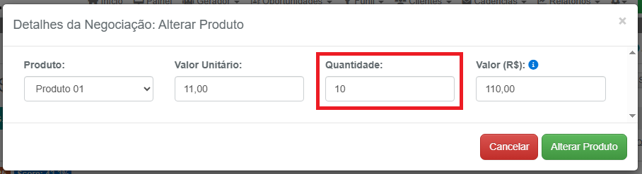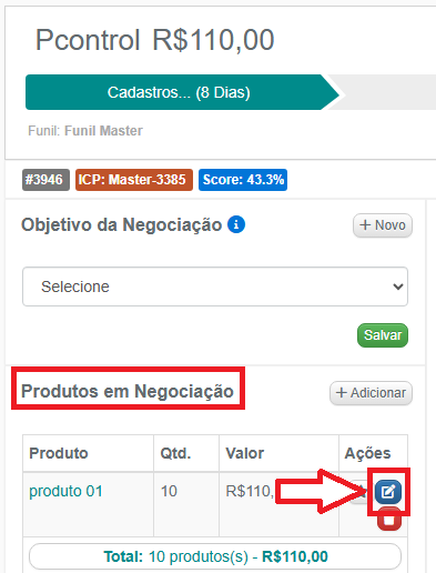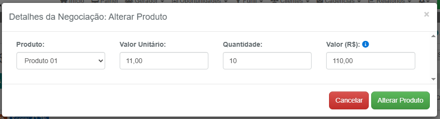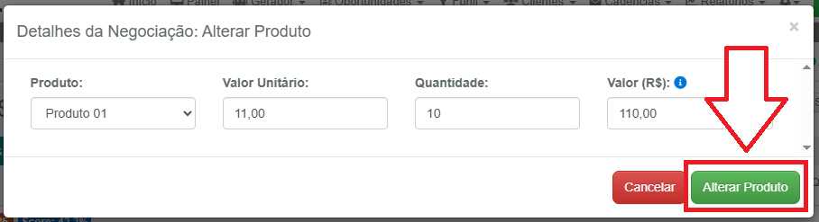 1- Na negociação que deseja atualizar o valor do produto, no bloco Produtos em Negociação, clique no botão azul Alterar Produto, na coluna Ações: