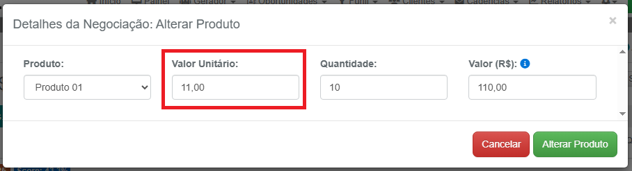 Digite no campo Valor unitário o valor que será usado para o produto selecionado nesta negociação.